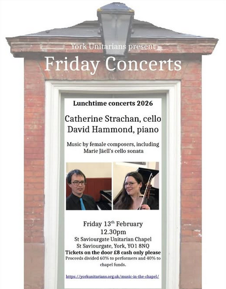 Our 2026 Friday lunch time concert series, begins this Friday, 13th February, with Catherine Strachan, cello David Hammond, piano, with a programme of music by female composers.